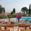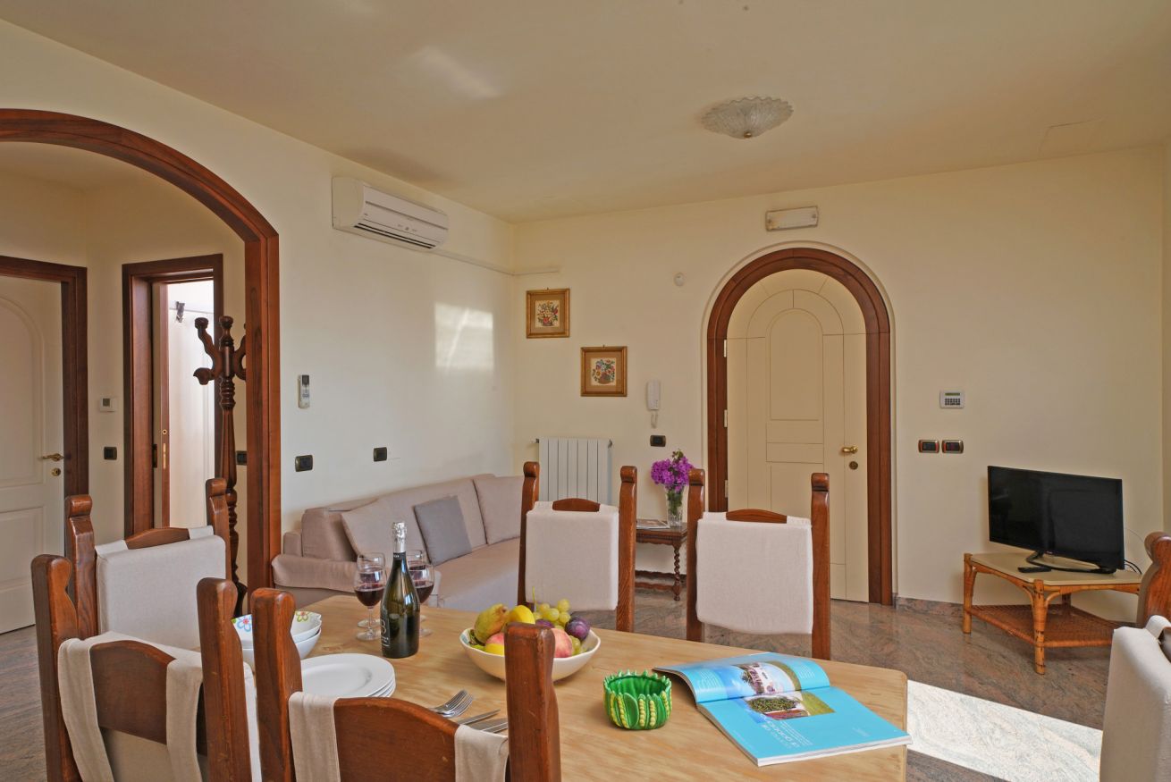 The bright living room opens onto our terrace overlooking our large swimming pool, creating an atmosphere of relaxation and enjoyment. The TV area offers a wide range of international channels, and the entire apartment is air-conditioned to ensure your comfort in every season.